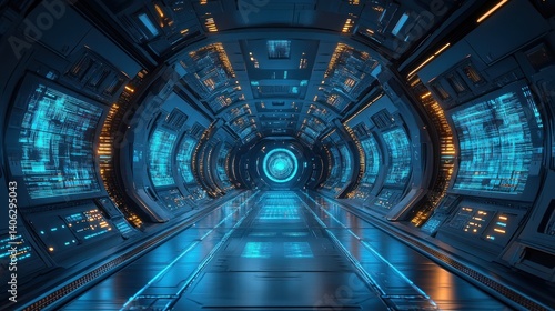 spaceship, corridor, futuristic, science fiction, technology, digital, tunnel, interior, three-dimensional, render, blue, orange, glowing, screen, panel, light, modern, dark, metallic, shiny, neon, abstract, virtual, space, ship, machine, environment, design, artwork, graphic, illustration, science, fiction, innovation, advanced, hallway, passage, computer, monitor