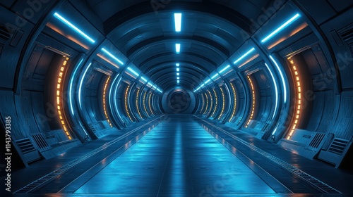 futuristic, spaceship, corridor, tunnel, neon, blue, orange, light, glow, technology, science, fiction, space, cosmos, abstract, background, interior, design, architecture, modern, sleek, metallic, shiny, vibrant, dark, mysterious, empty, pathway, journey, travel, exploration, infinite, endless, perspective, line, circle, curve, reflective, glossy, clean, sterile, advanced, innovation, progress, digital, virtual, unreal, render, three-dimensional