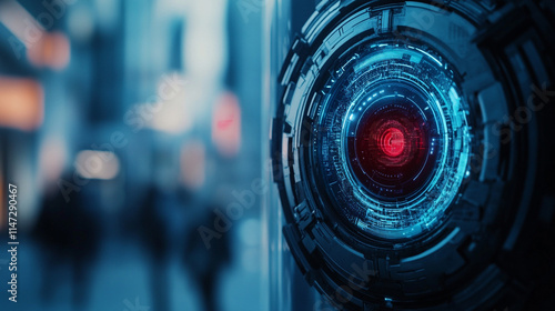 surveillance, technology, urban, city, crowd, device, monitoring, futuristic, pedestrian, glowing, architecture, signal, light, activity, red, blue, vision, scene, people, movement, security, design, artificial intelligence, electronic, digital, environment, modern, innovation, city landscape, observation, infrastructure, tech, urban life, advanced, communication, safety, atmosphere, visual, pattern, object, network