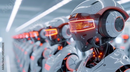 Futuristic teamwork: Robots and humans under brilliant, advanced technology lights. Illustration, Image, , Minimalism,