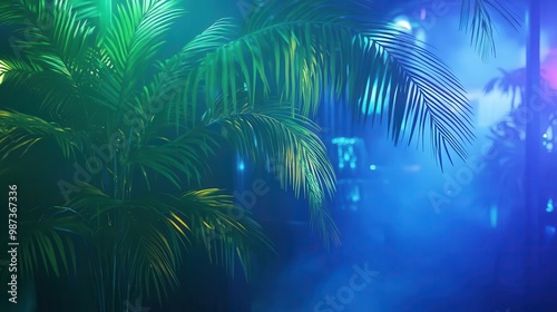 futuristic tropical nightclub scene neonlit palm leaves electric blue and green glow foggy atmosphere