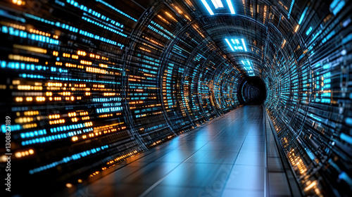 Futuristic tunnel with glowing lights and digital patterns