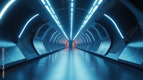 tunnel, futuristic, neon, light, blue, dark, science fiction, glowing, abstract, modern, architecture, space, design, technology, digital, render, three-dimensional, art, graphic, interior, corridor, linear, line, glow, bright, long, metal, steel, smooth, reflective, shiny, perspective, angle, empty, background, future, fantasy, concept, dream, science, cosmic, retro