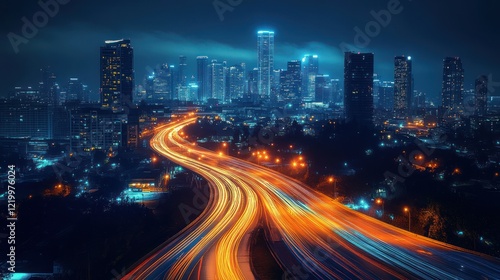 Futuristic Urban Cityscape at Night with Light Trails and 5G Technology Development