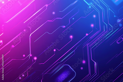 Futuristic vector illustration of an abstract circuit board with neon blue and purple gradients, showcasing intricate digital patterns and tech elements