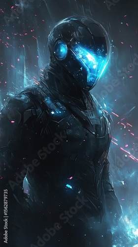 futuristic, figure, helmet, suit, high technology, dark, glowing, technology, science fiction, armoring, character, design, digital artwork, fantasy, illustration, cybernetic, alien, action, hero, male, nobody, outdoors, night, cloudy, adult, unknown, digital artwork