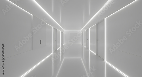 Futuristic white corridor with LED lighting and minimalist design