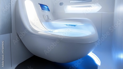 modern, bathtub, futuristic, sleek, white, curved, water, blue, lighting, integrated, screen, control, minimalist, seamless, clean, design, technology, innovative, smooth, luxury, spa, relaxation, wellness, comfort, contemporary, elegant, sophisticated, bathroom, vessel, ambient