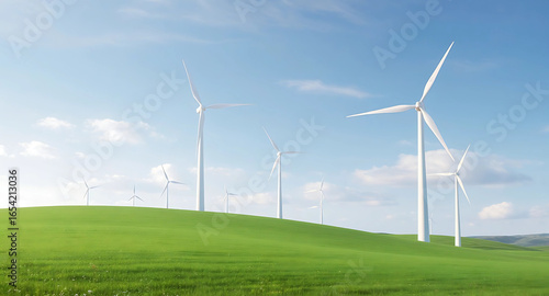 Futuristic Wind Turbines on Green Hill with Clear Sky