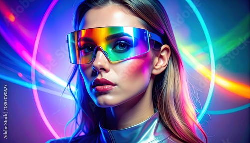 woman, goggles, neon, futuristic, reflective, visual, ray, shining, energetic, lip, shine, rainbow, glow, light, skin, innovation, glowing, beam, eye, graphic, prism, high technology, movement, display, dynamic, action, face, vibrant, hair, portrait, effect, light, technology, modern, art, girl, scene, concept, style, design, fashion, creative, colourful, beauty, bright, holographic, background, closeup