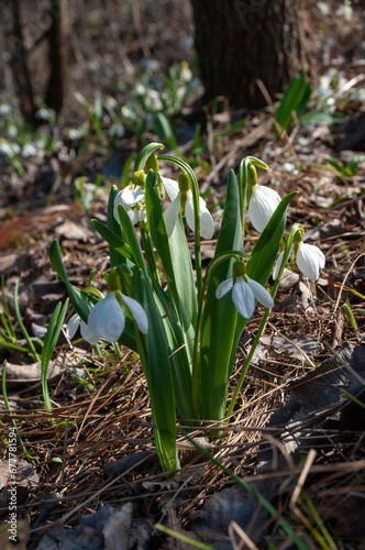 Galanthus elwesii (Elwes's, greater snowdrop), medium shot of blooming snowdrops in the wild