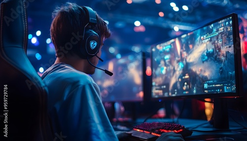gamer, gaming, headset, earphones, microphone, monitor, display, screen, keyboard, backlit, illuminated, red, blue, light, game, video, competitive, sharpened, concentration, player, chair, desk, technology, digital, virtual, earth, action, strategy, hand, finger, dark, night, blur, background, glow, colours, futuristic, intense, serious, passion, hobby, fun, entertainment, leisure, sport, arcade
