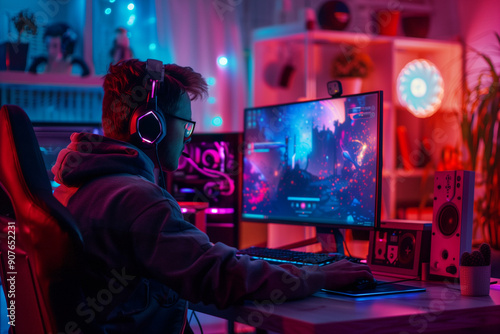 gamer, gaming, video, game, computer, desktop, monitor, headset, keyboard, mouse, screen, player, playing, technology, digital, electronic, entertainment, cyber, virtual, neon, future, fantasy, lighting, colourful, night, room, desk, chair, accessory, action, gameplay, joystick, controller, console, rpg, strategy, arcade