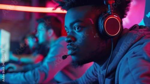 gamer, black, man, victory, technology, computer, home, room, sport, living room, happy, success, celebration, portrait, neon, cyberspace, game, microphone, fun, apartment, earphones, online, electronic, screen, virtual, chat, entertainment, computer monitor, gaming, streaming, player, competition, animation, mic, african american, professional, best, championship, display, live, playing, talk, tournament, video game, video game