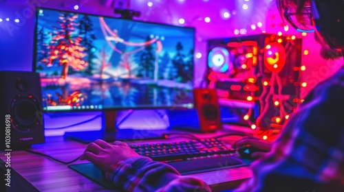 gamer, hand, mouse, keyboard, computer, desk, neon, light, purple, pink, blue, red, room, game, playing, screen, monitor, desktop, gaming, setup, technology, digital, entertainment, mousepad, headset, cable, wire, night, dark, glow, bright, sharpened, blur, lighting, shadow, surface, closeup, overhead, night time, home, workspace, studio