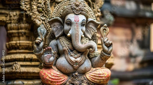 Ganesha statue close-up, Hindu deity symbolizing wisdom and prosperity, ornamental sculpture in a temple, cultural art from India, spiritual decor image.