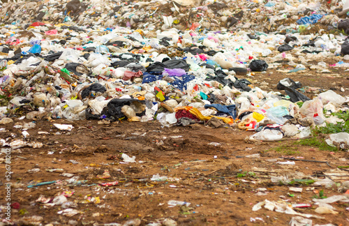 garbage dump pile in landfill and sunset