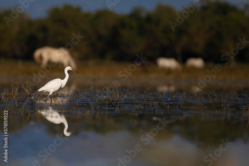 Garceta común (Egretta garzetta) reflejada pescando en el Parc Natural dels Aiguamolls de l'Empordà (Parque Natural de los Aiguamolls del Empordá) Castelló d'Empúries, Girona, Catalunya