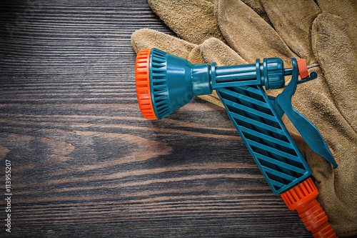 Garden hose nozzle protective gloves on vintage wood board agric