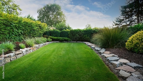 garden, landscaping, stone, border, lush, green, lawn, nature, vibrant, plant, flower, design, fresh, greenery, natural, beautiful, serene, turf, manicured, grass, floral, peaceful, backyard, garden-bed, planting