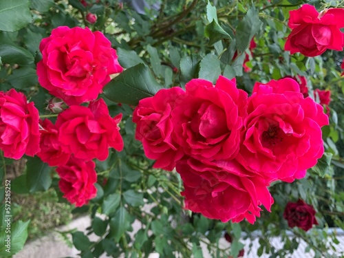 Garden red rose. Bush of fragrant roses outdoors. Image of beautiful nature