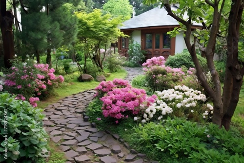 Garden with blooming flowers and pathway