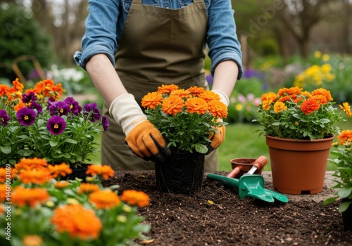 gardening, flower, pot, orange, plant, dirtied, hand, glove, apron, daylight, flora, foliage, cultivation, horticulture, bloom, blossom, violet, pansy, tool, spade, green, clothing, denim, holding, growth, nature, outdoors, activity, lifestyle, hobby, care, spring, summer, work