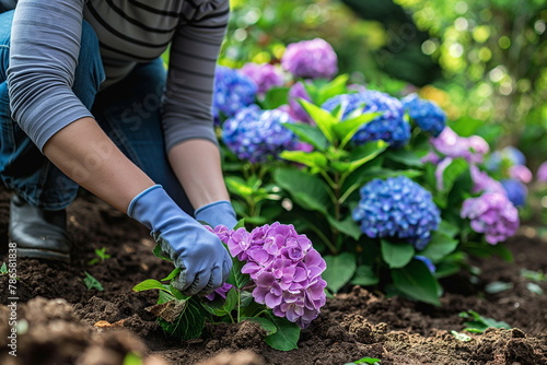 Gardener Planting Vibrant Purple Hydrangeas in Soil with Careful Tending, perfect for gardening tutorials or the beauty of hands-on horticulture