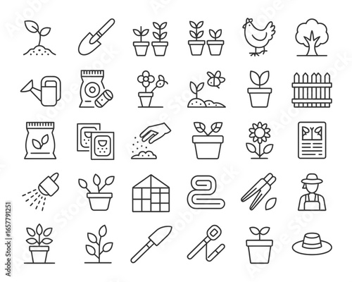 gardening, farming, plant, germinating, seed, pot, watering can, shovel, fertilizer, flower, bee, tree, chicken, fence, greenhouse, gardener, hat, pruning shears, trowel, planting, cultivation, growth, agriculture, farm, vegetable, nature, outdoors, illustration