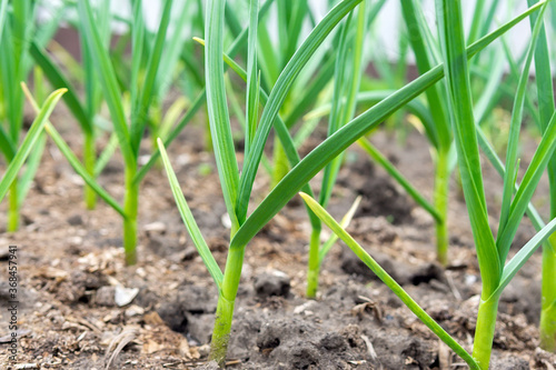garlic plantation is cultivated in the garden. selective focus