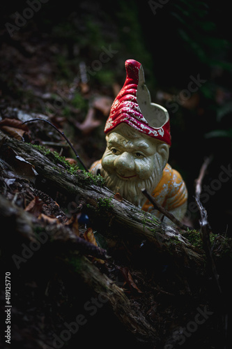 Gartenzwerg in einem dunklem Wald, mystische Stimmung