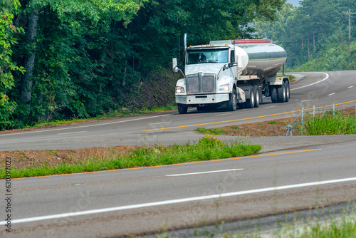 horizontal, tanker, delivery, truck, trucking, semi-truck, semi, vehicle, white, silver, transportation, transport, front view, road, highway, rural, secondary road, sky, foggy, hazy, interstate, expressway, land vehicle, outdoors, color image, green, tree, grass, tractor, trailer
