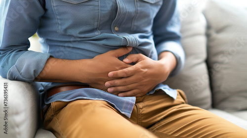 Gastroenterologist examining patient with stomach pain on couch in clinic, closeup
