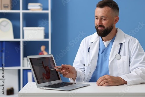 Gastroenterologist showing screen with illustration of stomach at table in clinic