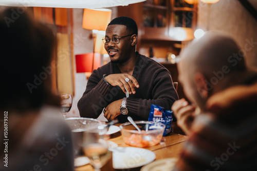 Gathering of friends sharing food, drinks, and laughter around a cozy dinner table. The atmosphere is lively, emphasizing connection and positive relationships within a warm and welcoming environment.