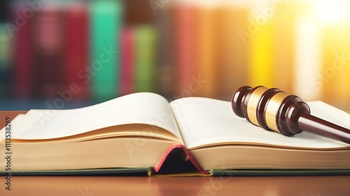 Gavel rests on open legal textbook beside colorful books
