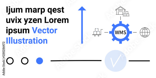 Gear with WMS surrounded by warehouse, globe, and forklift icons blue arrow pointing upward. Ideal for logistics, supply chain, warehouse operations, inventory control, process optimization, business