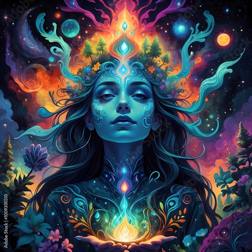 spirituality, ritual, spiritual, hallucinogen, kaleidoscope, lively, dynamic, colourful, quadratic, phantasmagoric, soft, fog, glister, star, aura, light, shine, woman, colours, portrait, enjoyment, enjoy, moment, his, experience, experience, spirit, spirit, awareness, merge