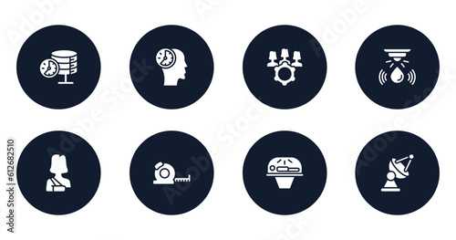 general filled icons set. flat filled icons sheet included real time data, patience, project team, water sensor, shoulder immobilizer, tape measure, solarium, satellite antenna vector.