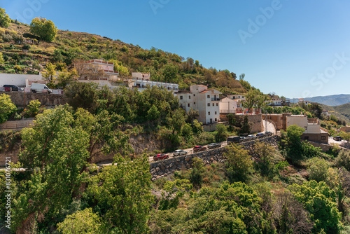 general view of a beautiful mountain village with its houses among trees and some cars parked on the road.