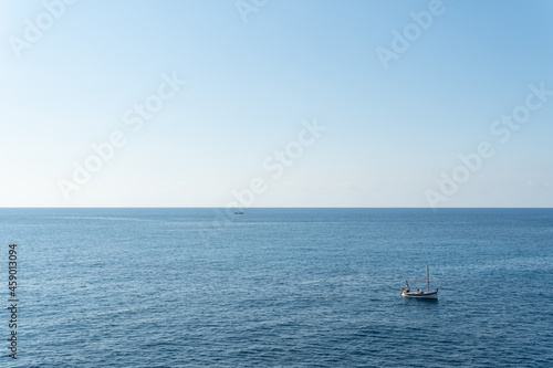 General view of the Mediterranean Sea with a fishing boat, called Llaut, sailing in the sea. Rocky coast of the island of Mallorca, Spain