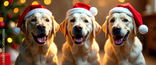 Generate a vibrant, festive AI photo of cheerful Labrador dogs wearing Santa hats, celebrating New Year's Eve. Focus on playful energy, warm lighting, and a celebratory atmosphere. Depth of field sh