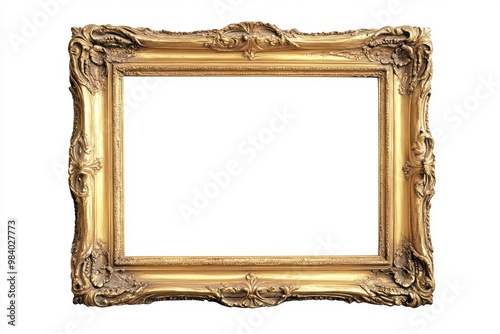 Generate an image of an ornate, rectangular gold picture frame with detailed carvings along