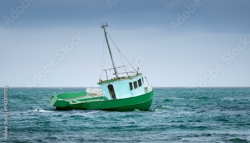 Generated 물속에 반쯤 가라앉은 작은 배, 파도 위로 흔들리는 반파된 배의 일부mage
