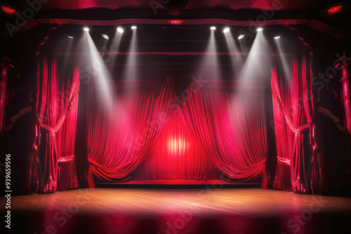 curtain, stage, opera, spotlight, theatre, performance, spot, velvet, audience, award, cinema, comedy, auditorium, film, classical, drama, concert, magic, presentation, ceremony, orchestra, show, textile, music, open, play, entertainment, front, premiere, event, luxury, theatrical, circus, broadway, scene, fabric, interior, drape, night, retro, illustration, light, red, decor, background