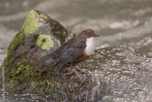 dipper, water, closeup, river, stream, rock, stone, side, blurred background, copy space, white, brown, scotland, britain, britain, britain, contrast