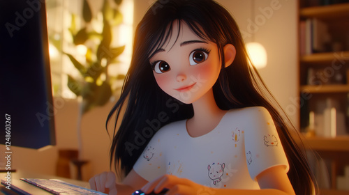 Generated image. A girl is working online on a computer. 3d styling. looping