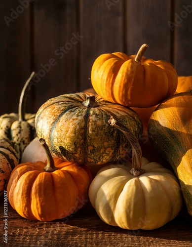Generated image A pile of assorted squash and pumpkins with rustic textures in warm natural light
