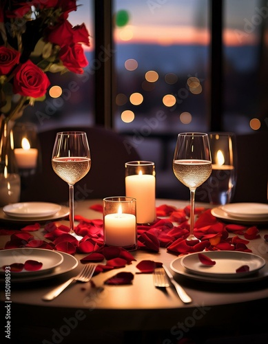 Generated image A romantic candlelit dinner setup with rose petals scattered on a table, wine glasses