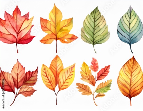 Generated image Autumn leaves watercolor set. Beautiful fall foliage. Seasonal decor. Botanical clipart
